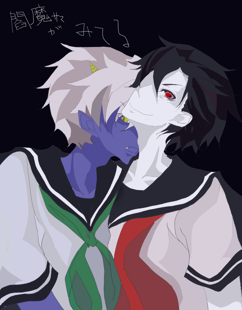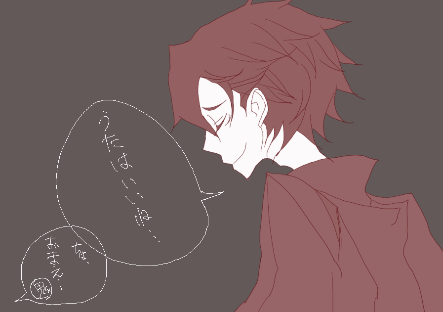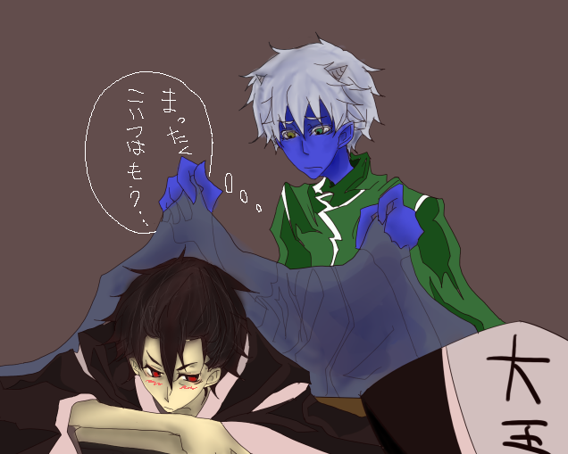 ↑と、どうにも引きずりがちなネタはおいておいて。図1.狸寝入りで秘書の行動を窺う大王と、なんだかんだでゲロ甘な秘書。大王は彼のこういうところにいちいち惚れ直すこと請け合いです。……プログラムから”優しさ”の消えたお絵かきツールでは、いったん描き始めるともう後戻りできない極限状態に陥ります。一息に描きあげるなどと…なんという無茶を……ざわ…ざわ…。←